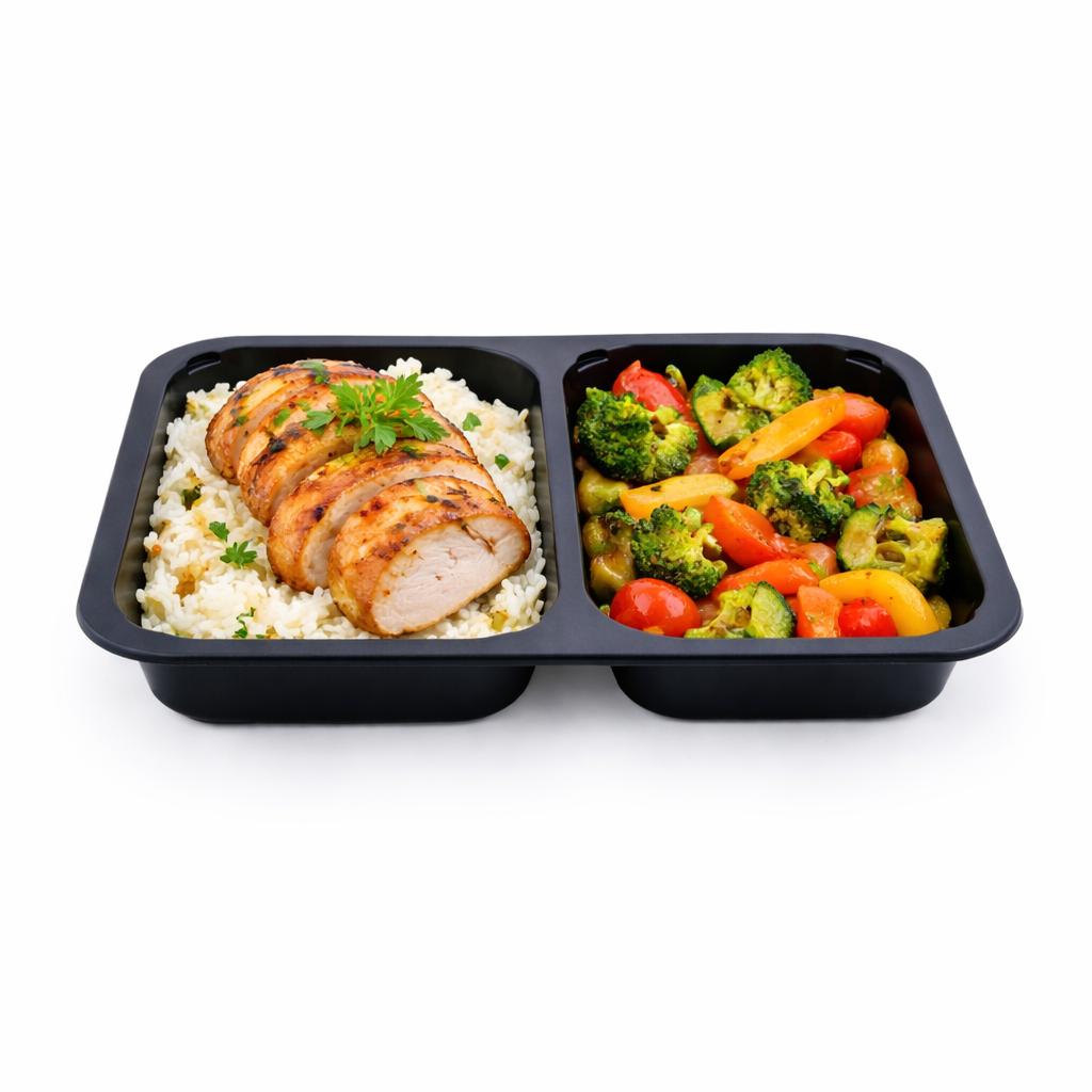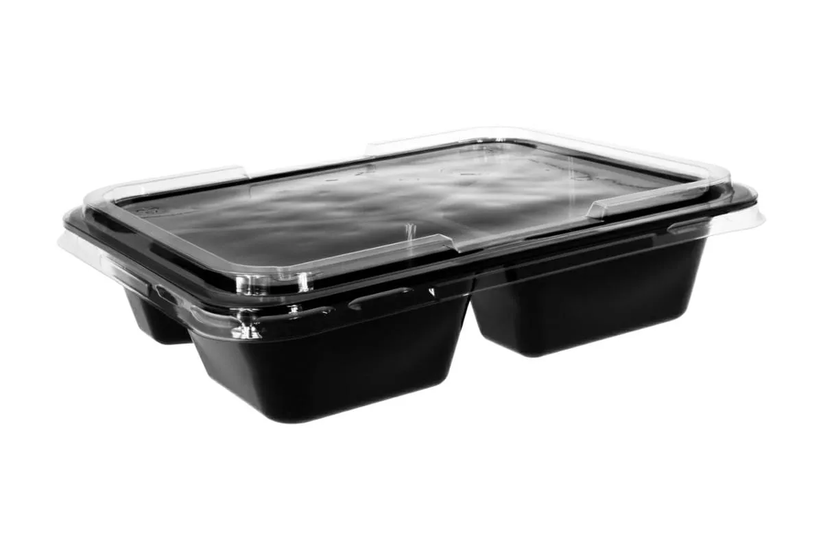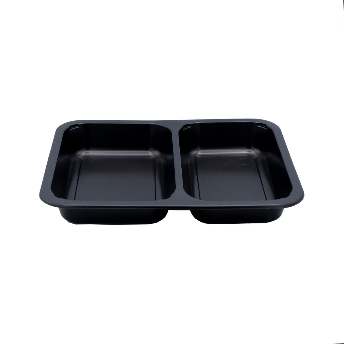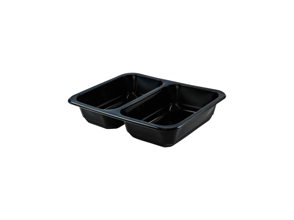 Dvoukomorová nádoba z černého polypropylenu (PP) je určena pro profesionální uzavírání pomocí (zatavení fólií). Tento způsob balení je standardem moderní gastronomie, protože zajišťuje maximální hygienu, bezpečnost a dlouhou trvanlivost pokrmů.